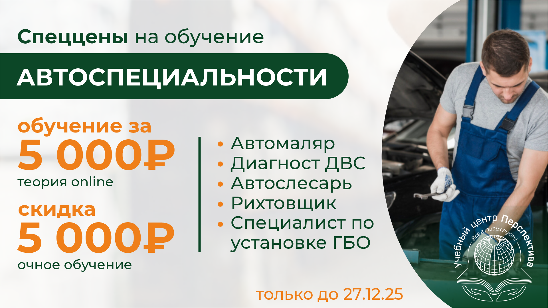 Сейчас действует скидка на обучение по любым рабочим профессиям, а также дополнительная скидка на курсы по автоспециальностям: